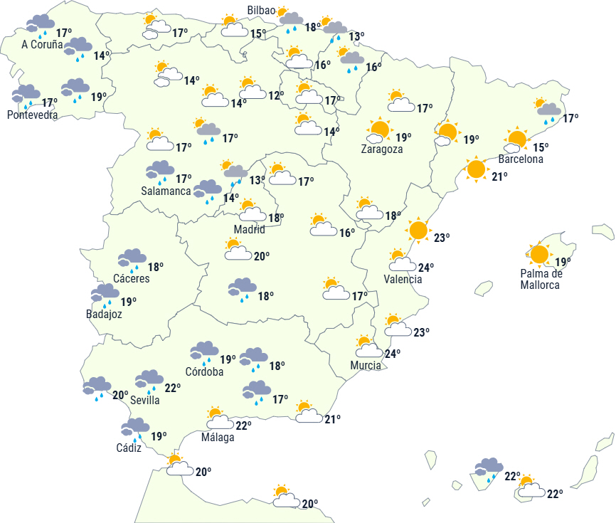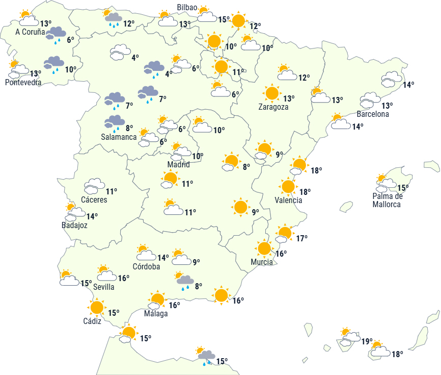 Dagstemperaturerne stiger i vest og centrum af Den Iberiske Halvø, mens de falder i nordøst og på De Baleariske Øer.