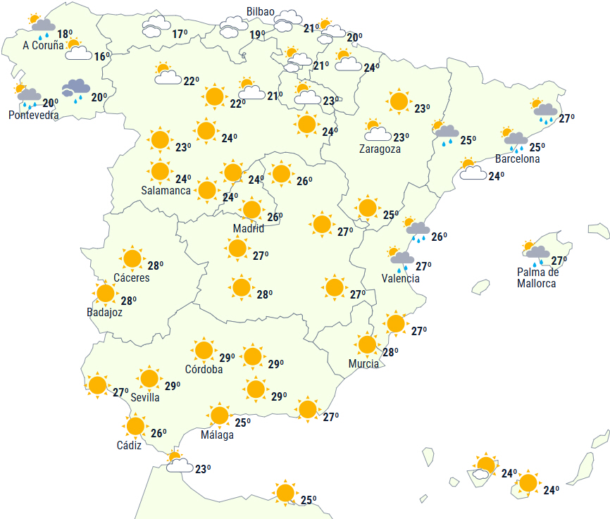 Kun på den nordøstlige spids af Den Iberiske Halvø forventes der skyet eller helt overskyet himmel, og fra de første timer er der mulighed for enkelte svage regnbyger i den østlige del af Cantábrico og sandsynlighed for byger lejlighedsvis med torden i området omkring Pyrenæerne og det østlige Catalonien - lokalt er kraftig nedbør.