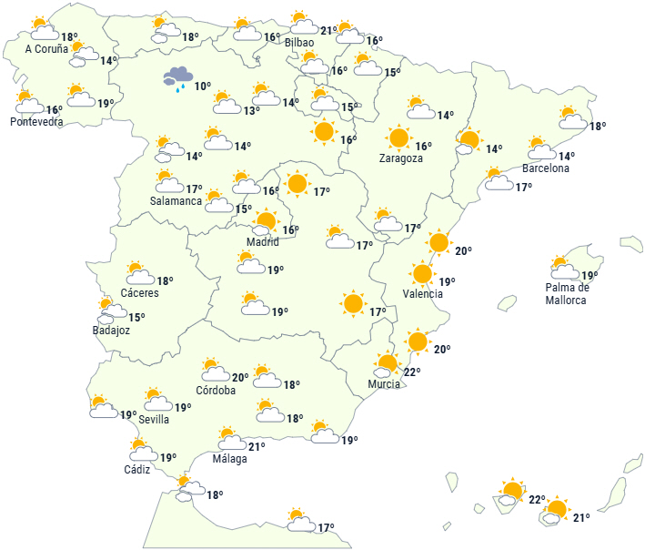 I Galicien, Cantabrien og de sydlige områder af den atlantiske halvdel forventes også lavthængende skyformationer om morgenen med mulighed for tåge og dis.