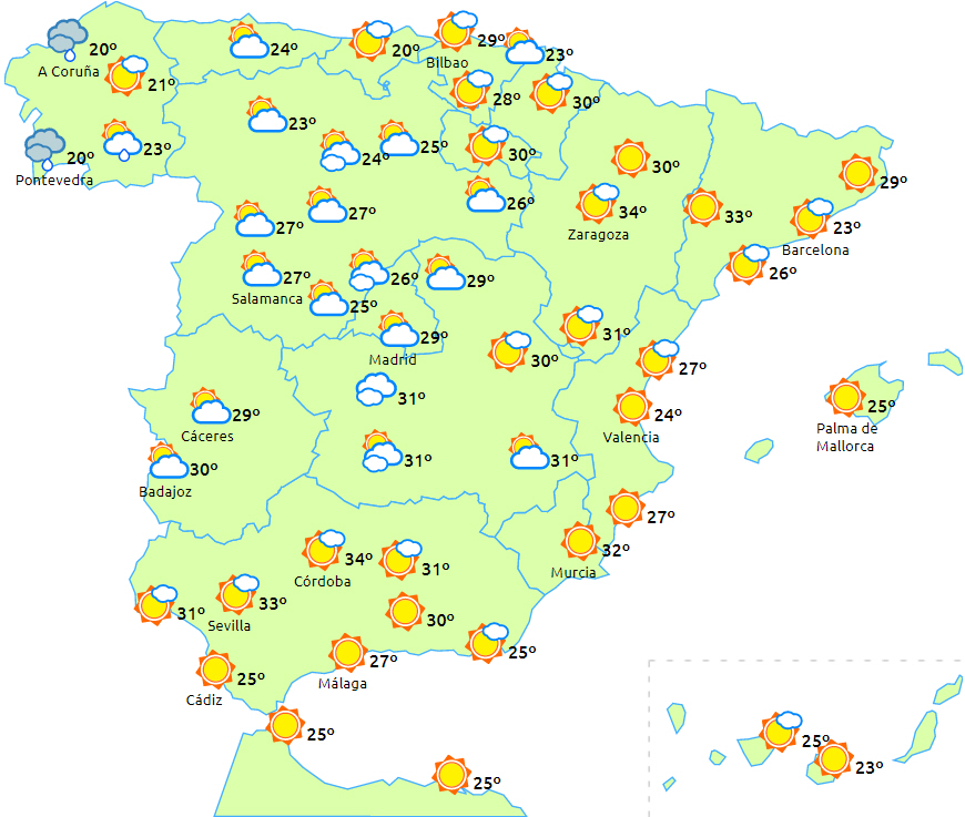 Dagstemperaturerne falder i den vestlige del af Galicien, men stiger på stort set resten af resten af halvøen, og vi kan komme over 35 grader i Guadalquivir-dalen. Minimumstemperaturerne vil stige i det meste af Andalusien samt i halvøens indre egne. Kun få ændringer i resten af landet.
