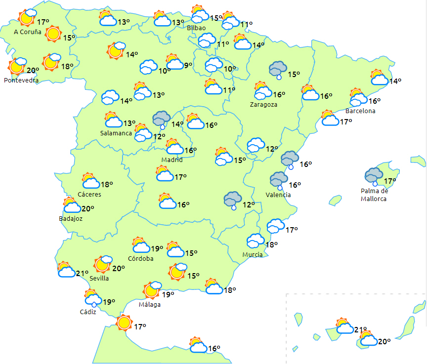 Den østlige del af halvøen vil fortsat være under indflydelse af stormen Celia. Tætskyet i hele landet, og der forventes nedbør til den nordlige del af halvøen, som kan være vedvarende i den østlige del af nordvestkysten og i Middelhavsområdet. Vedvarende og lokalt kraftig i den sydlige del af Valencia, det nordlige Alicante og Murcia.