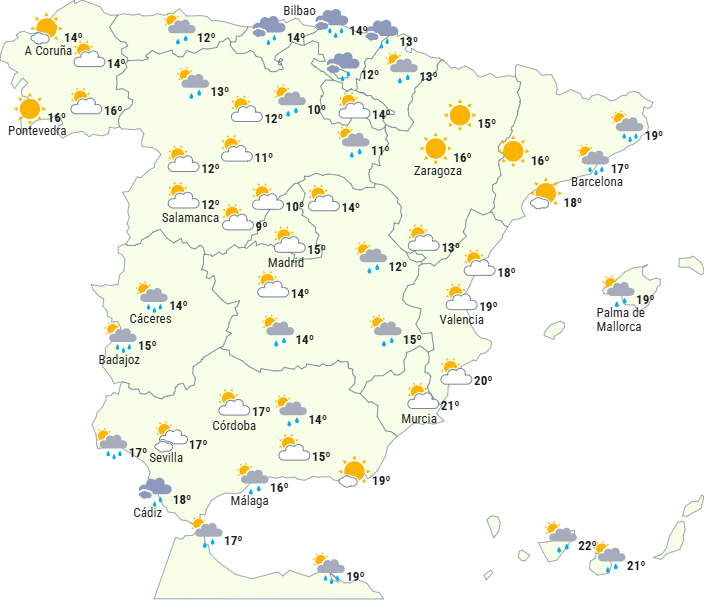 Der forventes nedbør i Cantabrien, på den sydlige halvdel af den atlantiske side og ved Alborán, og der kan forekomme pletvise byger på andre steder på den atlantiske sider, øgrupperne og den sydøstlige del af halvøen. Lejlighedsvise tordenbyger i sydvest, hvor de lokalt kan være kraftige og vedvarende i Cádiz-bugten.