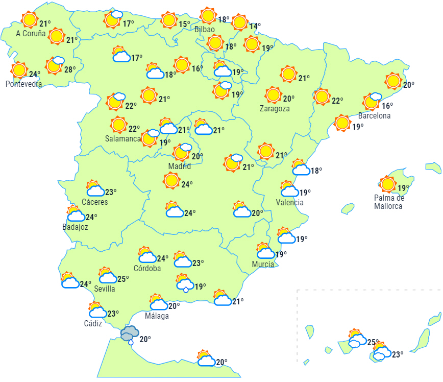 Der vil også være overskyet himmel over det østlige Cantabrien og Pyrenæerne med sandsynlighed for lette byger, der vil have tendens til at aftage i løbet af dagen for så at klare op.