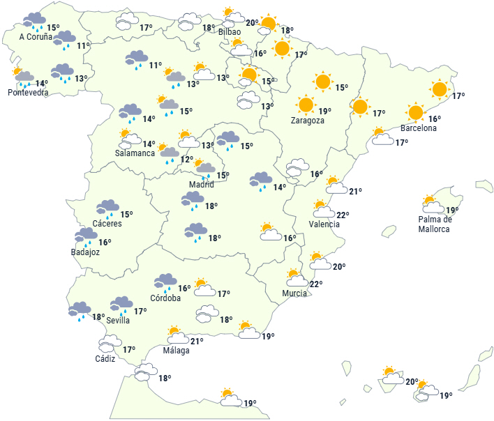En lavtrykszone fra Atlanterhavet nærmer sig og giver plads til to på hinanden følgende koldfronter, der trænger ind fra nordvest. Der forventes regn og byger til det meste af Den Iberiske Halvø, men med vedvarende nedbør i Galicien og mindre sandsynligt og i hvert fald kun i svagere form i Middelhavsområdet. Nedbøren når ikke De Baleariske Øer.