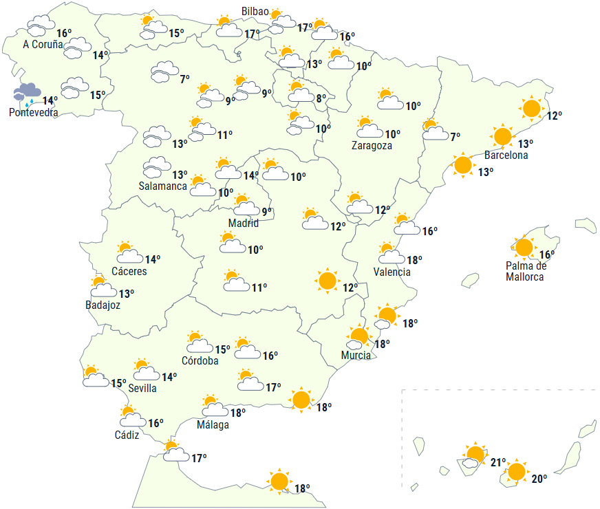 Der forventes overvejende letskyet eller klar himmel i det meste af landet. Imidlertid vil ankomsten af en Atlanterhavsfront give skyet eller overskyet himmel med nedbør på den nordvestlige tredjedel af halvøen med sandsynlighed for kraftig og lokalt vedvarende nedbør i det vestlige Galicien og muligvis også andre dele af den helt vestlige del af halvøen.