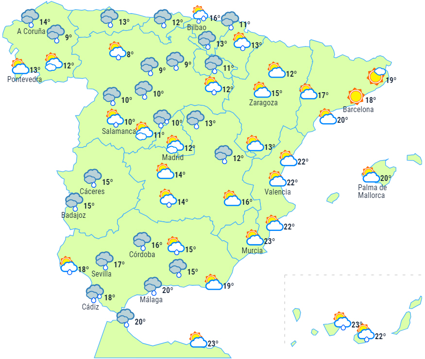 Skyet eller overskyet himmel med nedbør i den nordlige del af Galicien, det cantabriske område og halvøens Atlanterhavsområder. Nedbøren er svagere og mere spredt i starten, men vil intensiveres i løbet af eftermiddagen og aftenen.