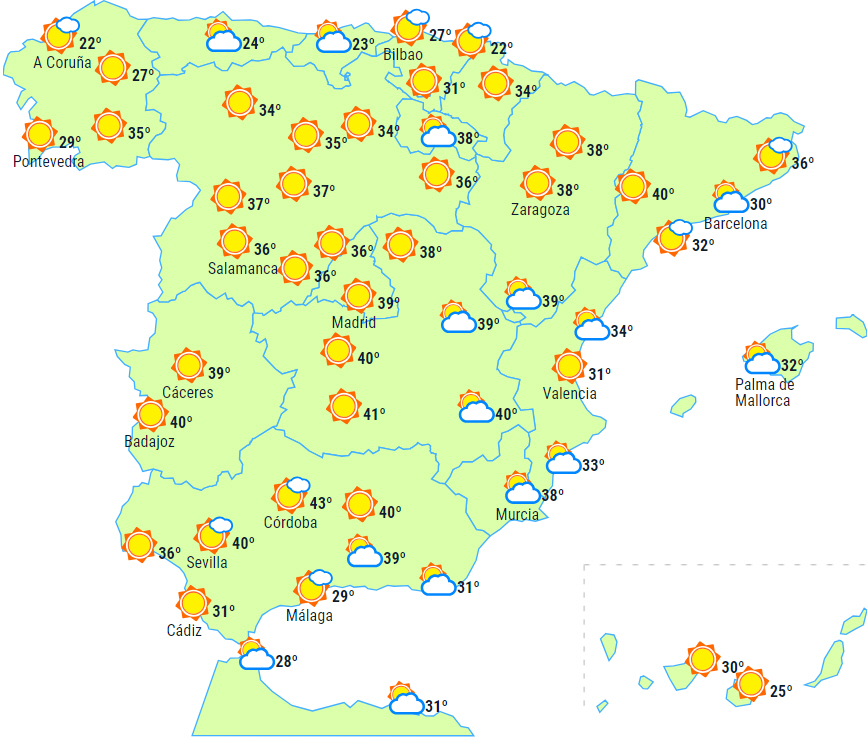 Temperaturerne forventes at stige næsten over hele linjen. Således vil temperaturerne overstige 36 grader i de fleste indlandsområder på den sydlige halvdel og det nordøstlige af halvøen samt dele af den nordlige højslette og indlandsområder på Balearerne. Det er endda sandsynligt, at vi når 38 til 40 grader i Andalusien, den sydlige højslette og det indre af Ebro-dalen - lokalt måske endda 44 grader!