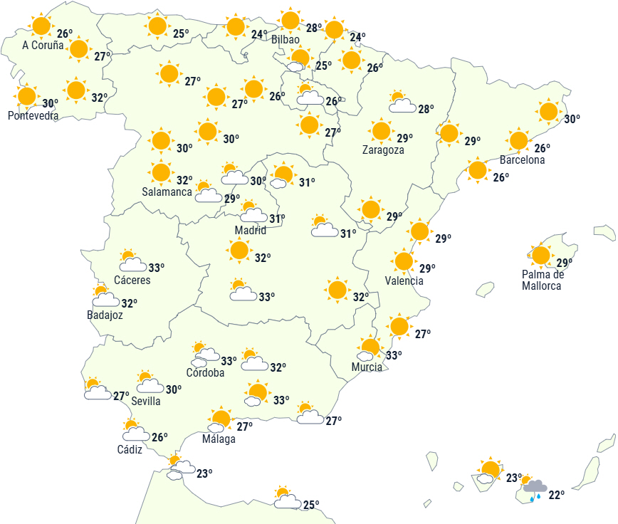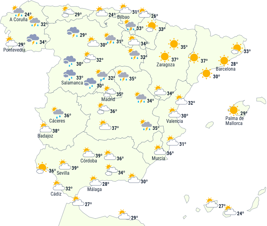 Dagstemperaturerne falder i sydvest og på den østlige tredjedel, mens de stiger markant i Galicien og Cantabrien og forbliver uændrede i resten. Der forventes 34 til 36 grader på den sydlige Atlanterhavskyst, i dalene i det nordlige højland og i Galicien samt den indre Ebro-dal, og vi kan endda nå 38 til 40 grader i dalene på den sydlige Atlanterhavskyst og enkelte steder i Miño.
