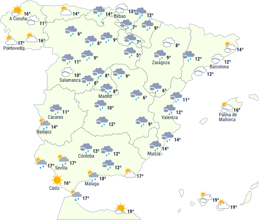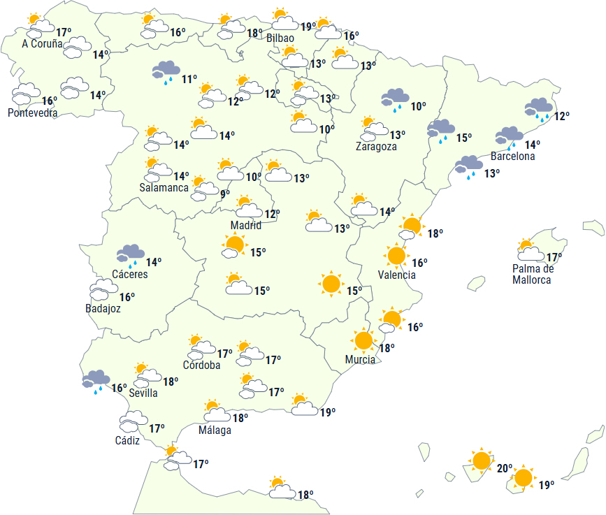 Resterne af lavtryksstormen Laurence vil sammen med højtrykket over Centraleuropa sætte gang i en fugtig vind mod den nordlige Middelhavskyst. Himlen vil være meget skyet eller overskyet over halvøen og De Baleariske Øer, men der forventes opklaringer over den sydlige del af halvøen hen på eftermiddagen.
