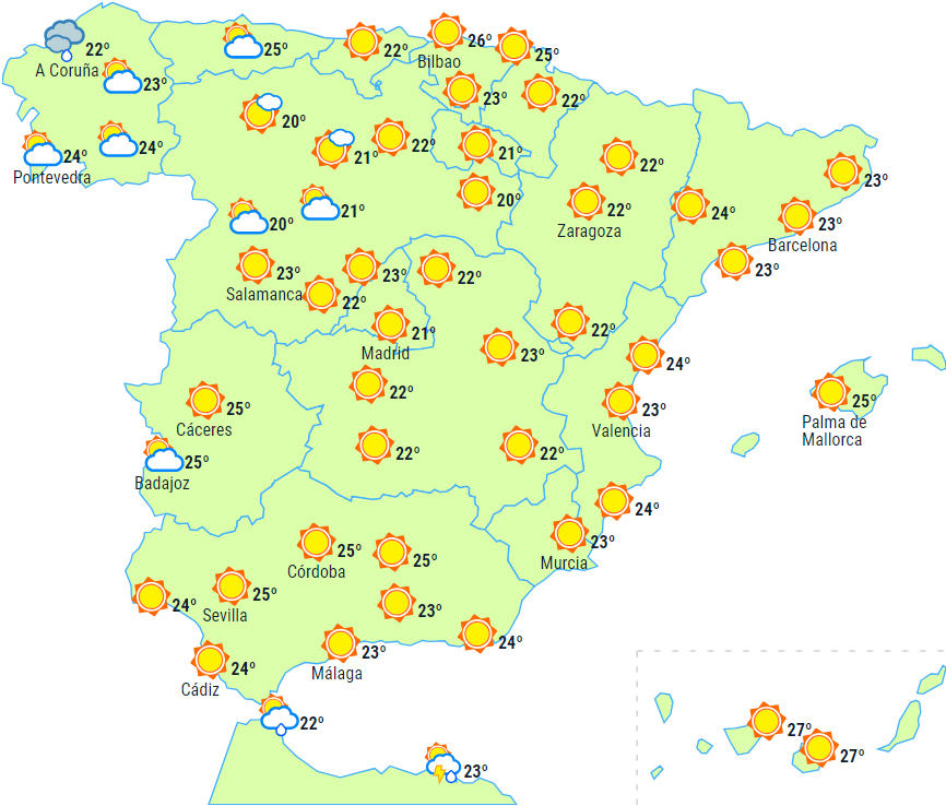 Nattemperaturerne vil stige i det østlige Middelhavsområde og i Ebro-dalen og falde i resten. Dagstemperaturerne vil stige i Levanten og falde i resten, undtagen i Ebro og det vestlige Andalusien og Extremadura, hvor der kun forventes små ændringer.