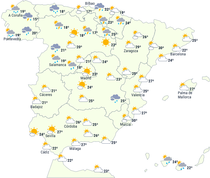 Perioder med skyer og mulighed for lejlighedsvise byger, mest sandsynligt i bjergområderne om eftermiddagen. Nattemperaturerne stiger i den østlige del af regionen og ellers kun få ændringer i resten. Dagstemperaturerne falder, undtagen i Middelhavsområdet, hvor de er uændrede. Dermed lander vi på 24 til 28 grader og 13 til 20 om natten.