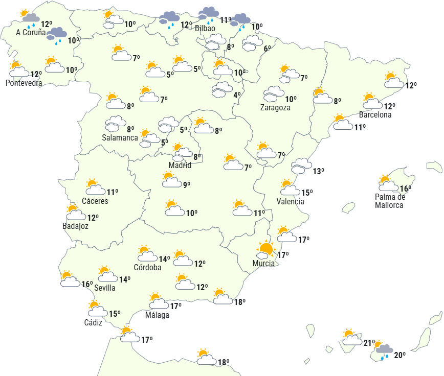 Svag frost i det nordlige indland, den nordøstlige del af det sydlige højland og bjergkæderne i sydøst, moderat frost i Pyrenæerne og De Iberiske Bjerge.