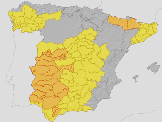 Varsler om lokalt kraftig og/eller vedvarende nedbør i store dele af den sydlige halvdel af halvøen, i nordvest og i Pyrenæerne. Dagens varselskort for regn alene ser sådan ud:
