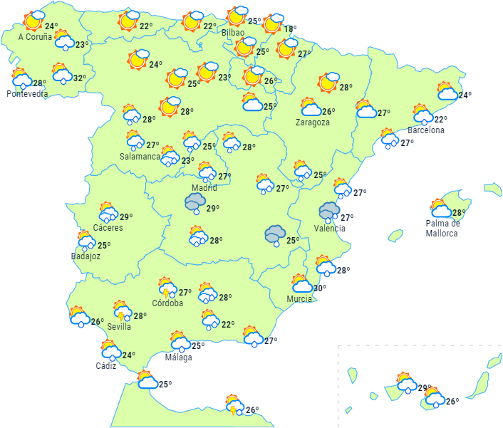 På resten af halvøen og Balearerne vil dagen starte med blå himmel afbrudt af enkelte perioder med højtliggende skyer, undtagen i Levante-området, Gibraltarstrædet og Melilla, hvor der vil være overskyet i perioder med mulighed for let regn.