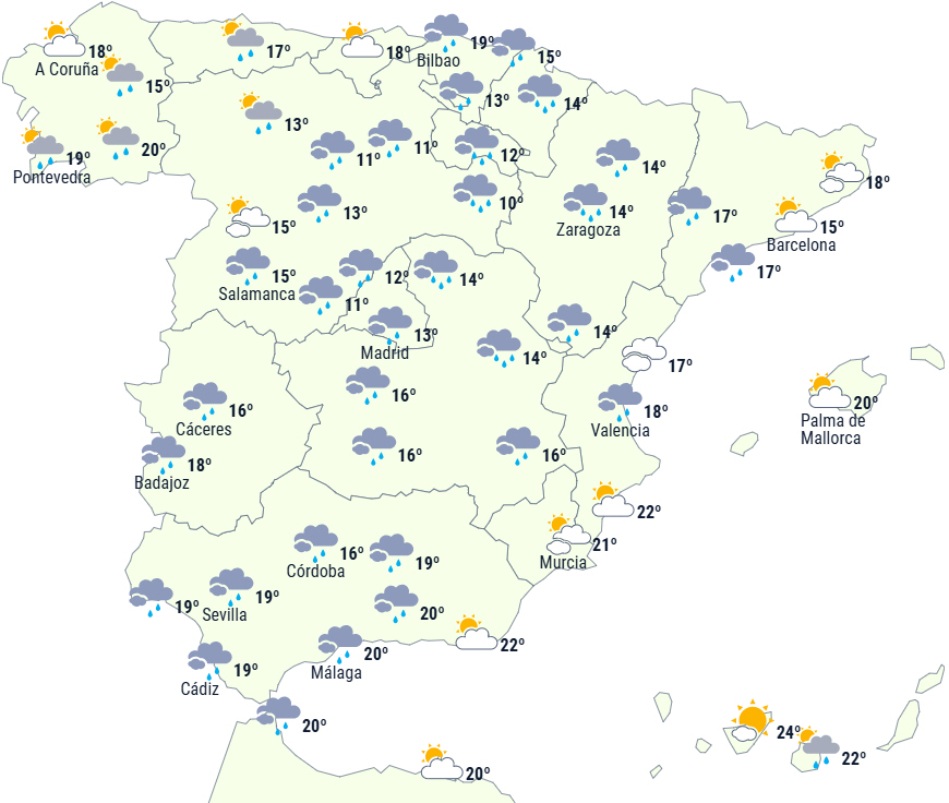 - Der er risiko for lokalt kraftige regnbyger med torden i Galicien, Den Cantabriske Bjergkæde, den nordlige del af højlandet, La Rioja og på Tenerife. Nedbøren kan være vedvarende i dele af Ebro-dalen og i Pyrenæerne. Dagstemperaturerne falder markant på den nordøstlige tredjedel af Den Iberiske Halvø.