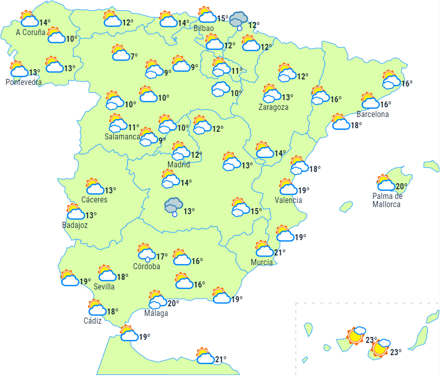 Dagstemperaturerne vil falde på det meste af halvøen. Nattemperaturerne kan stige en smule i det indre af den sydøstlige tredjedel, men vil falde på resten af halvøen, og særligt mærkbart på den nordlige højslette og i Extremadura. Kun få ændringer i resten af landet. Der vil forekomme let frost i Pyrenæerne, De Cantabriske Bjerge og på den nordlige højslette.
