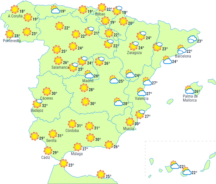 Stabilt vejr på halvøen og Balearerne med overvejende letskyet eller klar himmel. Kun i det nordlige Galicien, ved nordvestkysten, den øvre Ebro-dal og de vestlige Pyrenæer forventes overskyet himmel med svag og spredt nedbør, noget tungere i det østlige ende af nordvestkysten.
