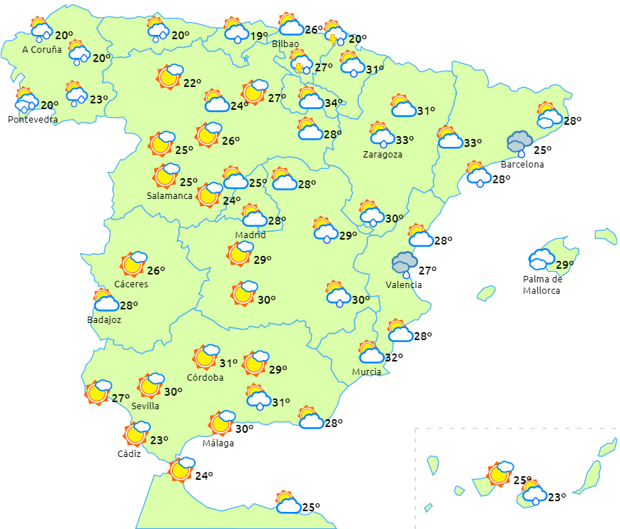 Kun små ændringer i temperaturerne i hele landet, dog med lette fald i det nordligste område og i Ebro-dalen. Temperaturerne vil overstige 30 grader i området omkring Ebro-dalen, i det sydøstlige indland og på Mallorca. Nattemperaturerne vil ikke falde til under 20 grader i dele af Ebro-dalen, så den står på tropenat.