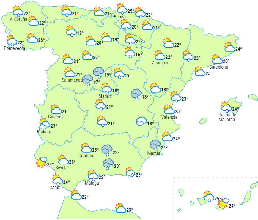 Skyet eller overskyet med byger og tordenvejr, der dog er mere sandsynligt og intenst om eftermiddagen i det østlige indland, hvor der lokalt kan være tale om kraftig nedbør. Temperaturer med små ændringer. Let vind fra øst på Middelhavskysten og fra skiftende retninger i resten.