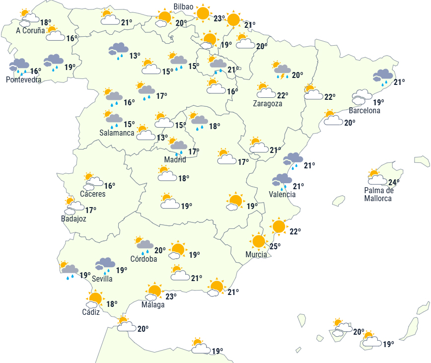 På den sydøstlige del af halvøen og De Baleariske Øer er regn mindre sandsynlig, og den vil være svag og spredt på resten af halvøen. Der forventes mellem- til højtliggende skyer, men mod dagens slutning opklaring i perioder - især på den vestlige del af halvøen.