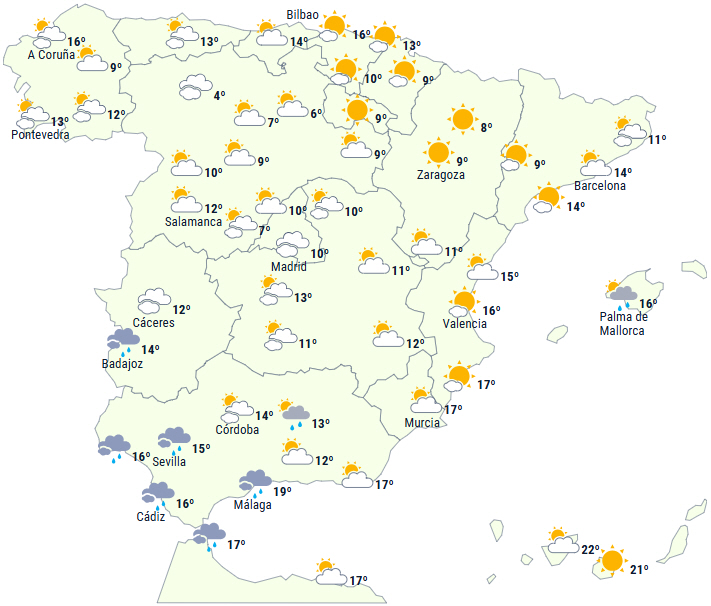 Skyet eller overskyet himmel ledsaget af let til moderat nedbør. Minimumstemperaturerne stiger, mens maksimumstemperaturerne generelt falder, lokalt uændret på vestkysten og i Axarquia. Dermed lander vi på 11 til 18 grader og fem til 11 i nat.