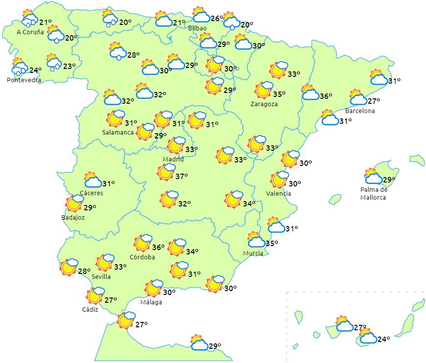 Dagstemperaturerne falder i den nordvestlige del af Andalusien, ved nordvestkysten og i de vestlige Pyrenæer. Temperaturerne overstiger 35 grader i Ebro-dalen, i det sydøstlige indland og på Mallorca. Minimumstemperaturerne vil falde i den vestlige del af Extremadura og omkring Ebro-dalen og De Iberiske Bjerge. Kun få ændringer i resten.