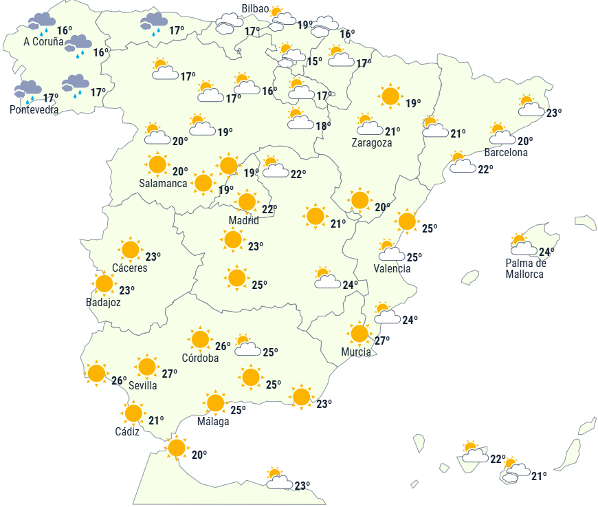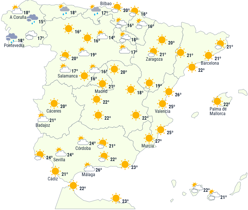 Dagstemperaturerne vil falde på De Baleariske Øer, ved Alborán og i det nordøstlige indland af Den Iberiske Halvø - muligvis markante fald i Pyrenæerne. Overvejende stigninger i resten af landet, dog kun lette stigninger på De Kanariske Øer. Vi kan komme over 30 grader ved kysterne på den sydlige halvdel af fastlandets Middelhavsområder og i Guadalquivir.