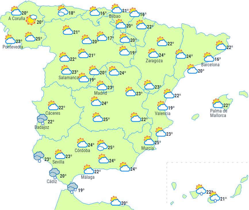 Temperaturerne vil falde næsten over hele linjen og kraftigt - endda markant lokalt i højderne på den sydvestlige del. Nattemperaturerne har også tendens til at falde, mens der dog forventes små stigninger i områder af Castilla-León. På trods af dette vil der kun forekomme let frost i Pyrenæerne og lokalt i andre bjerge i sydøst og på den nordlige halvdel af halvøen.