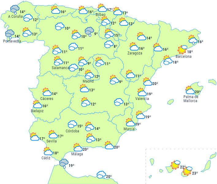 Stormene Babet og Aline forventes fortsat at have indflydelse på vejret på halvøen og De Baleariske Øer med ustabilt vejr og overvejende skyet eller overskyet himmel med nedbør, der bevæger sig fra vest mod øst.