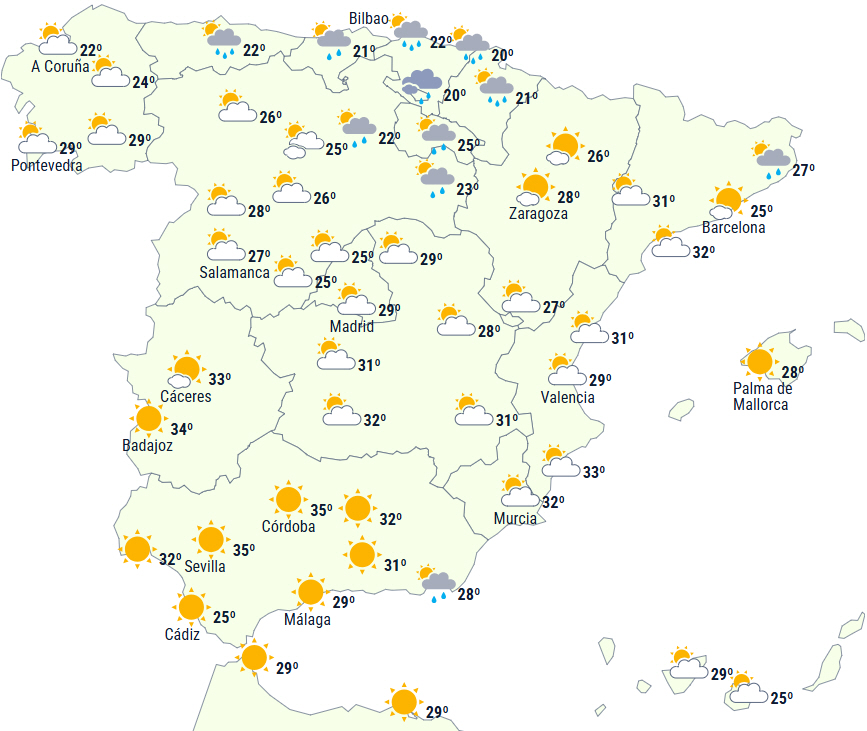 Dagstemperaturerne stigende på den vestlige halvdel af fastlandet, er faldende på den sydøstlige del og ellers med få ændringer eller et let fald i resten af landet. Vi kommer nok fortsat over 35 grader i områder af Guadalquivir.