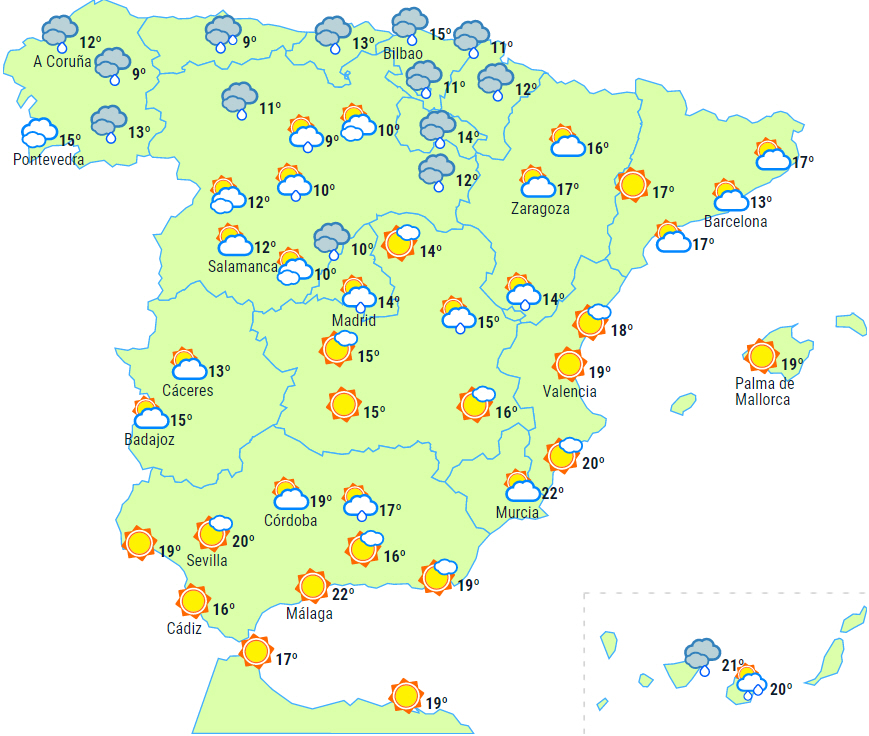 Overvejende klar himmel over den vestlige del af Andalusien, den østlige del af halvøen og Balearerne, selv om det ikke er udelukket, at der sidst på dagen vil falde lidt let regn på den nordlige del af disse øer.