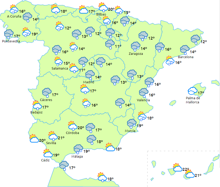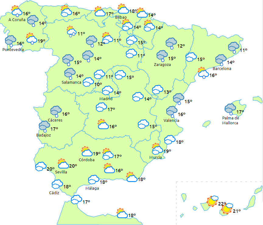 En Atlanterhavsfront vil trække ind over den sydvestlige del af halvøen og sammen med en fugtig vind fra øst i Middelhavsområdet vil den give overskyet vejr med regn og byger næsten overalt på halvøen fra sydvest til nordøst.