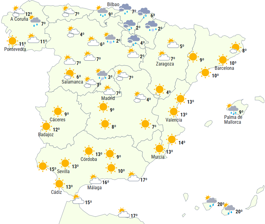 Frostgraderne vil brede sig og tage til, så der kan være tung frost i Pyrenæerne og moderat i de øvrige bjergområder på den nordlige halvdel og De Betiske Bjerge. Der ventes også svag frost i andre indlandsområder, især det nordlige højland.