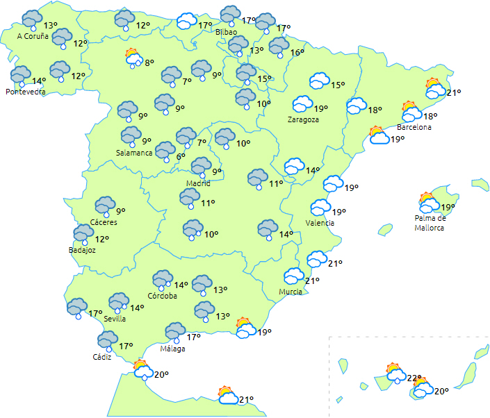 Der forventes skyet eller overskyet vejr og næsten udbredt nedbør over halvøen, når det breder sig fra vest til øst. Det ventes at holde tørt på det meste af østkysten, Balearerne og i Melilla. Kraftigste nedbør ventes på Atlanterhavssiden, i den vestlige del af de centrale bjerge, de sydlige indre egne samt i bjergene i det vestlige Andalusien. Nedbøren bliver ledsaget af lejlighedsvise tordenbyger i Galicien, ved nordvestkysten og i den vestlige del af halvøens indre egne.
