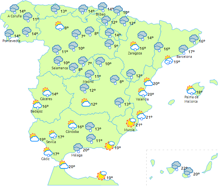 I dag varsles der om lokalt heldagsregn i dele af halvøens indre egne og i nogle af bjergene i Andalusien. Der advares også om kraftig vind i områderne nær Gibraltarstrædet og Alboran.