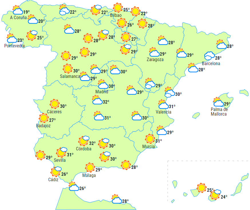 Der forventes stabilt vejr i det meste af landet med letskyet til klar himmel. Kun over Gibraltarstrædet, Melilla, Mallorca, ved Cataloniens kyst, i Galicien og ved Det Cantabriske Hav er der udsigt til lavthængende skyer om morgenen med risiko for tågebanker.
