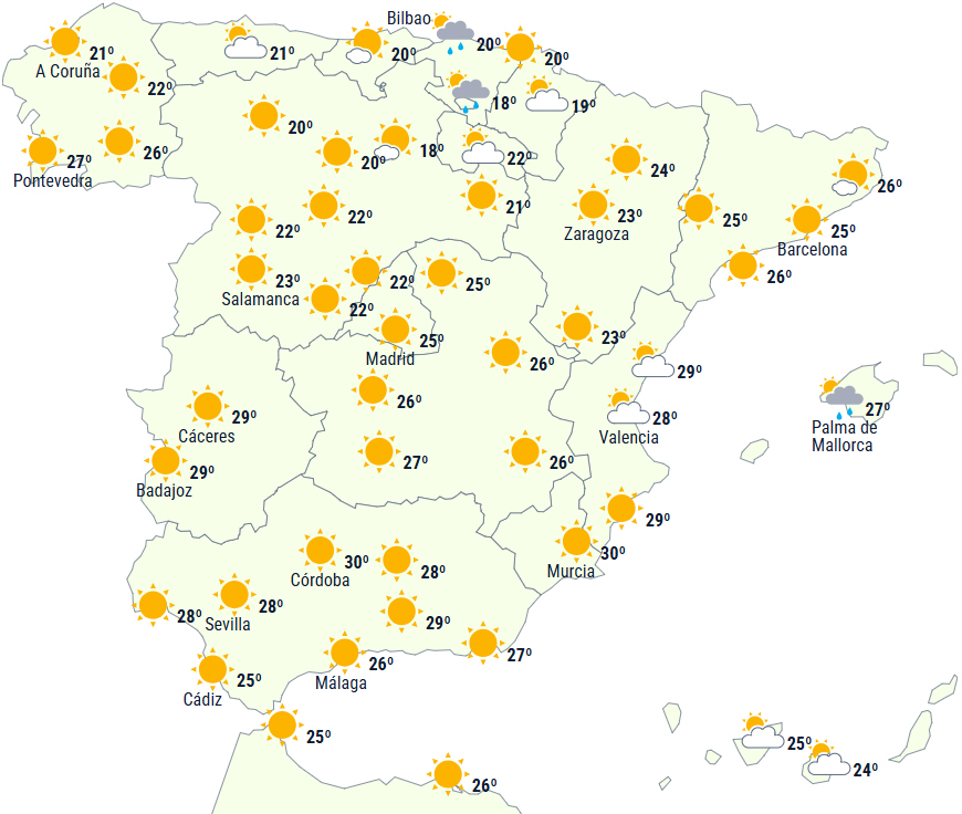 Dagstemperaturerne i let fald på middelhavssiden og på De Baleariske Øer og ellers generelt stigende. Der vil blive overskredet 35 grader i sydvestlige dale.