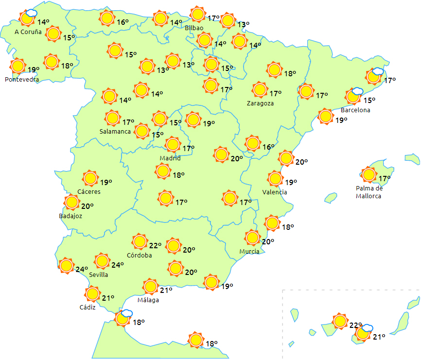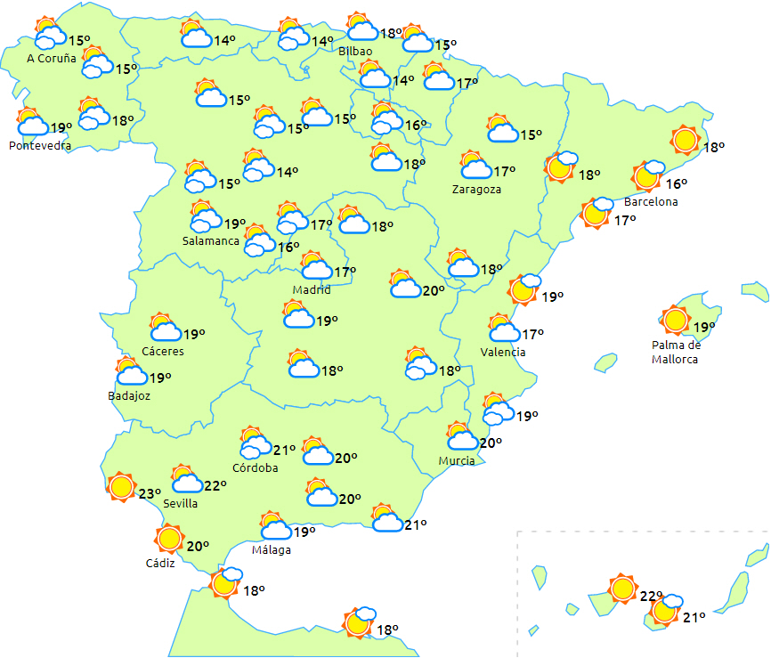 Der forventes tørt og solrigt vejr til det meste af landet med overvejende letskyet eller klar himmel. Kun ved nordvestkysten og i området omkring Gibraltarstrædet og Melilla er der perioder med overskyet vejr om morgenen.