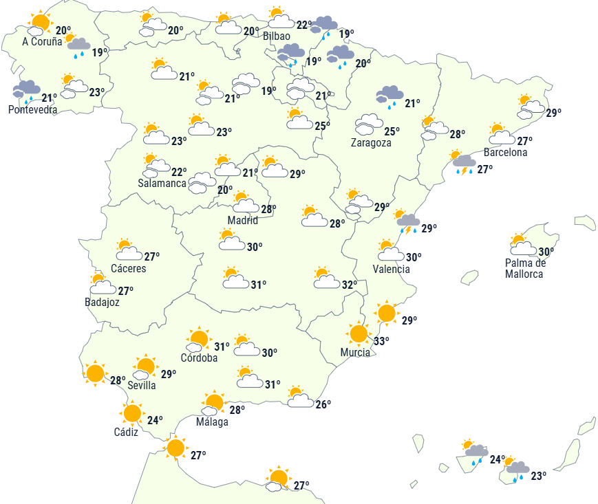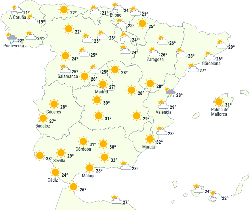 - Dagstemperaturer på 34/36 grader i Guadalquivir, det sydøstlige højland og det indre af Ebro-dalen.