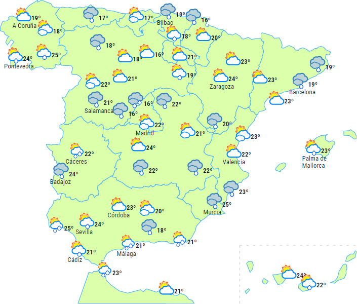 Dagstemperaturerne stiger på den nordvestlige halvdel af halvøen og i Catalonien og falder på den sydlige tredjedel og i Levante-området. Temperaturerne om natten stiger på den nordlige halvdel af halvøen, men ellers sker der kun få ændringer i resten af landet.