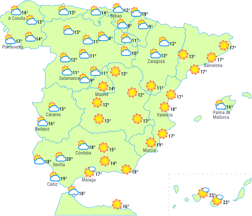 Temperaturerne falder på den helt sydlige del af halvøen og De Kanariske Øer. Nattemperaturerne falder på den sydlige og østlige halvdel af halvøen. Små ændringer i resten af landet. Frost i bjergområderne på halvøen, som lokalt vil være moderat i Pyrenæerne.