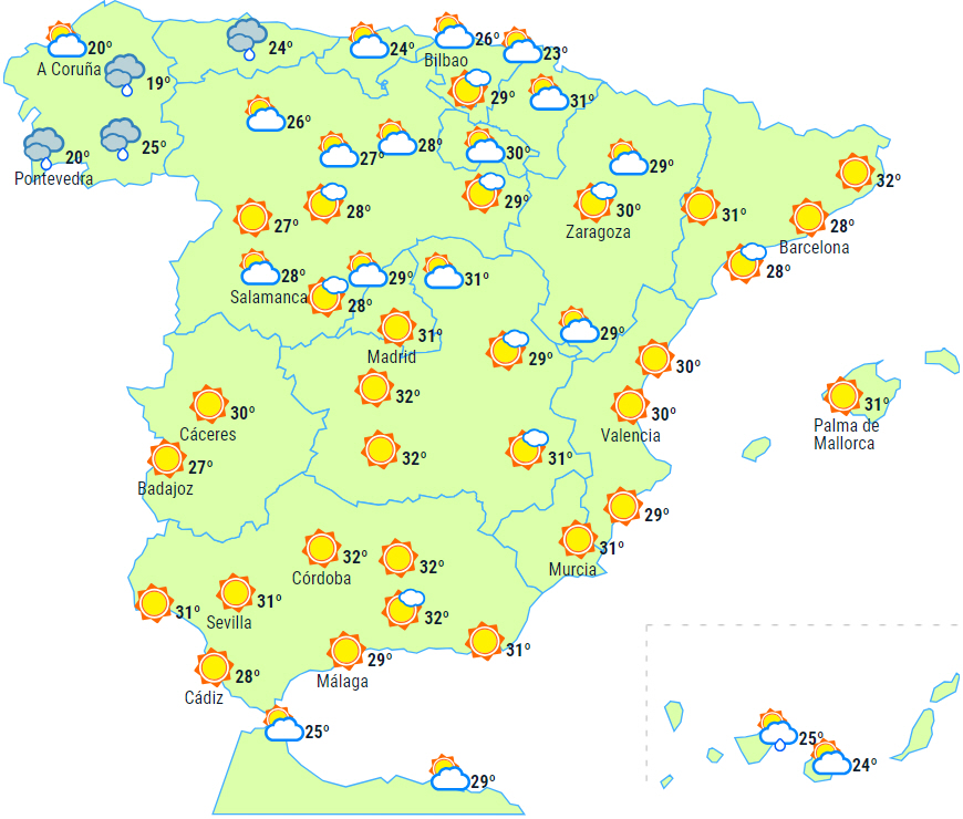 I løbet af dagen forventes der flere skyer i det centrale og sydøstlige af halvøen med mulighed for spredte byger og tordenvejr til den østlige tredjedel, dog mere sandsynligt i bjergene og og lokalt tung nedbør i Pyrenæerne, det østlige af De Iberiske Bjerge og det østlige La Mancha, men vi kan som nævnt heller ikke udelukke de sydøstlige bjerge.