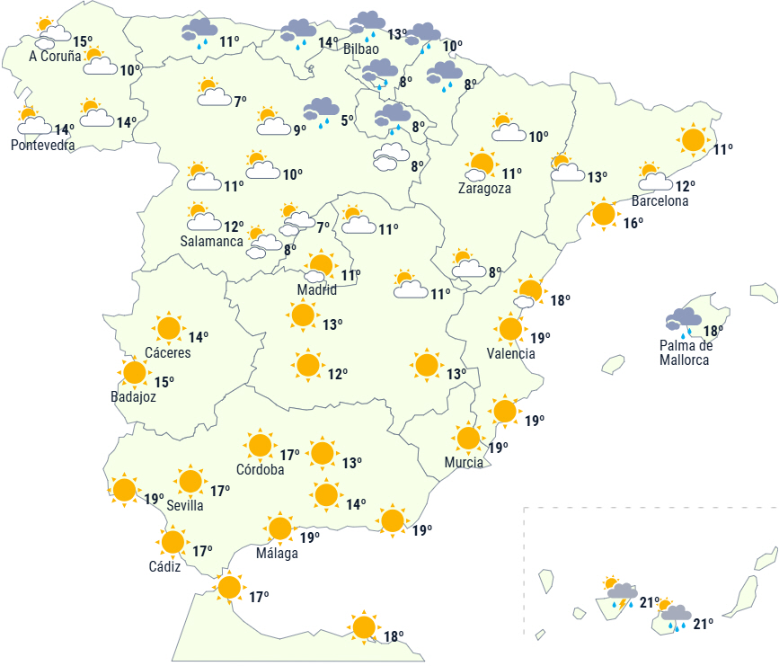 Stabilt vejr på Den Iberiske Halvø. En fugtig vind fra nord vil dog give overskyet himmel over den nordlige halvdel med nedbør, der påvirker Galicien, det cantabriske område, den øvre Ebro-dal, det nordlige af De Iberiske Bjerge og Pyrenæerne, hvor det forventes at være tungere og endda nå de centrale bjerge, det nordlige højland og De Baleariske Øer. Nedbøren falder som sne i bjergene med betydelige mængder i Pyrenæerne.