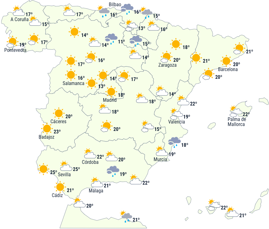 Overskyet himmel over den østlige halvdel og langs Middelhavskysten med byger ledsaget af torden. Letskyet i resten af regionen. Temperaturer i fald, og det gælder særligt markant for dagstemperaturerne i det østlige indland, mens nattemperaturerne i den vestlige halvdel forbliver uændrede. Dermed får vi det noget mere behageligt end i går, da vi kan nyde 23 til 25 grader og 13 til 19 om natten.