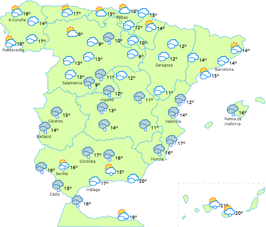 En Atlanterhavsfront i nærheden af det sydvestlige af halvøen skaber sammen med en fugtig østenvind fra Middelhavsområdet rigeligt med skydække over hele halvøen og Balearerne. Det sætter igen gang i nedbøren, som vil rammer næsten hele fastlandet og Balearerne.