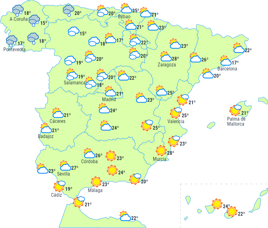 Dagstemperaturerne vil stige på begge øgrupper, i Galicien, ved nordvestkysten og på den østlige halvdel af halvøen, mens de falder på Atlanterhavssiden. Nattemperaturerne vil stige i det meste af landet, undtagen i den sydvestlige del, hvor der kun forventes små ændringer eller lette fald.