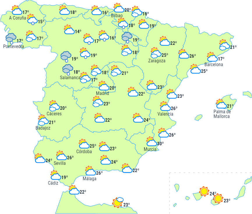 Ny atlanterhavsfront vil påvirke Galicien, Det Cantabriske Hav og det nordvestlige Castilla y León og give overskyet himmel med regn og byger. Nedbøren vil brede sig fra vest til øst i løbet af dagen og efterhånden aftage.