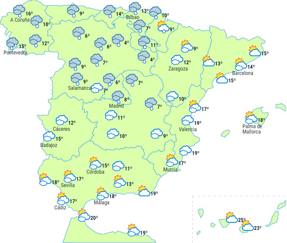 I Middelhavsområdet mere eller mindre klar himmel, men der kan dog komme let regn på Menorca. På resten af halvøen skyet eller overskyet med nedbør, men vådest på den nordlige tredjedel, mens det holder mere tørt, jo længere sydpå vi kommer.