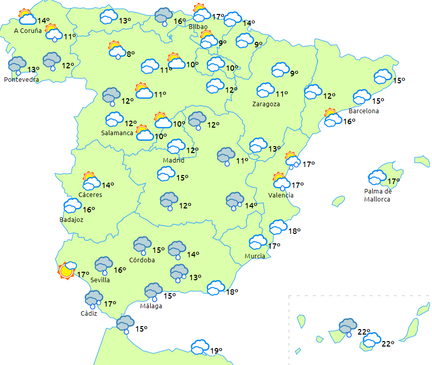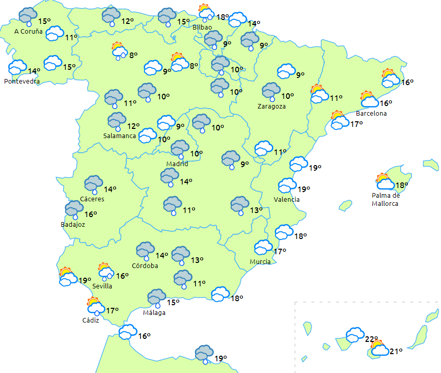 Overvejende skyet eller overskyet himmel over halvøen og Balearerne med udbredt nedbør i Galicien og på den sydlige Atlanterhavsside, som lokalt kan være vedvarende i det vestlige Galicien og i området omkring Gibraltarstrædet.