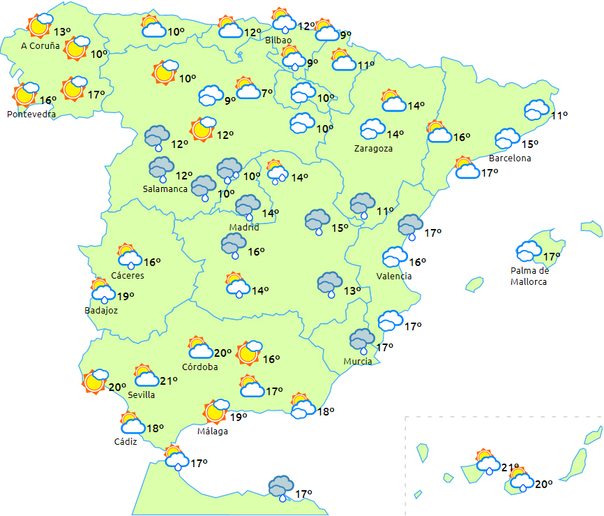 Der forventes byger til det meste af den sydlige halvdel af halvøen, men dog mest intense i den vestlige del af Andalusien, hvor de kan blive ledsaget af enkelte tordenbyger. På grund af tilstedeværelsen af calima vil det bliver forvandlet til en træls omgang mudderregn - ‘barro’.